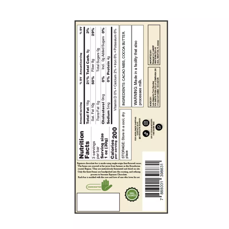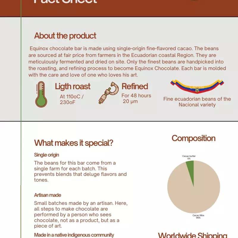 Equinox chocolate bar is made using single-origin fine-flavored cacao. The beans are sourced at fair price from farmers in the Ecuadorian coastal Region. They are meticulously fermented and dried on site. Only the finest beans are handpicked into the roasting, and refining process to become Equinox Chocolate. Each bar is molded with the care and love of one who loves his art. This bar is made within an indigenous community providing jobs and growth opportunities specially to women and young people.
