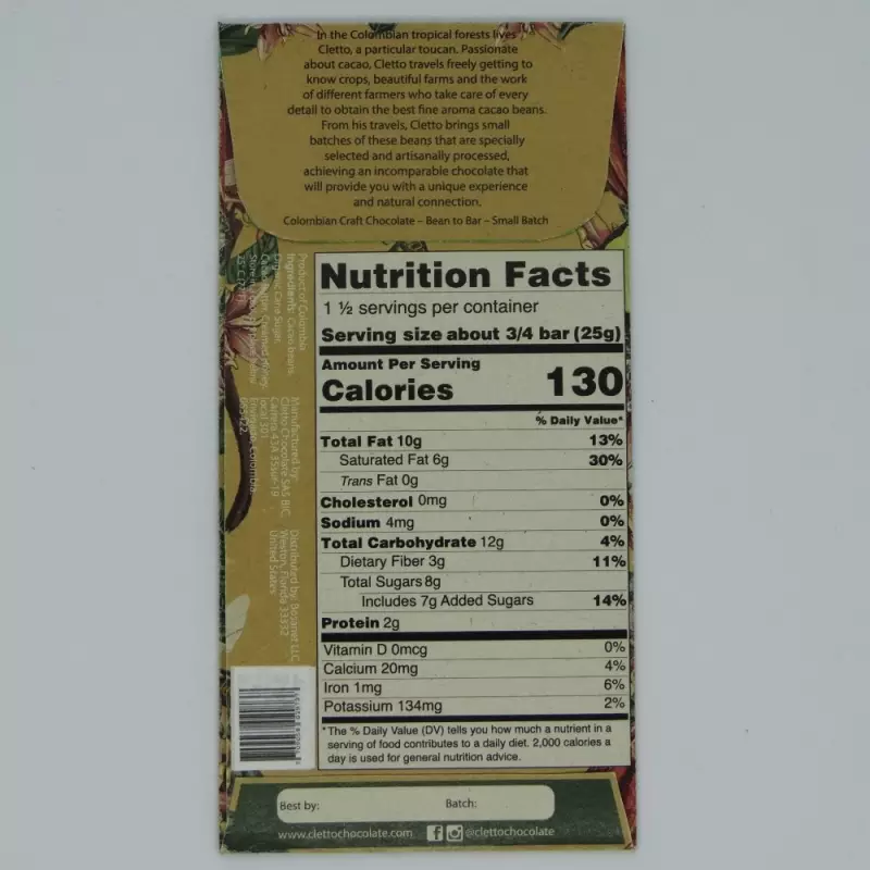 Cletto Chocolate is a company based in Envigado, Colombia. Since 2018, it has partnered with a group of cacao farms located in Antioquia. Through a Bean-to-Bar process, selected cacao beans are roasted and refined to produce high-quality chocolate. Cletto Chocolate's mission is to promote social and economic development for our growers and develop environmentally friendly packaging and processing alternatives.